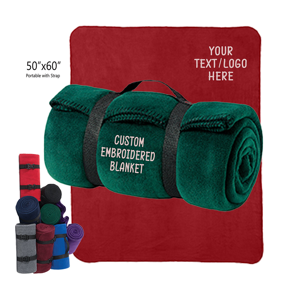 WYA-B-0004 This Custom Embroidered Polar Fleece Blanket is designed for practical use, clean branding, and easy portability, making it an ideal choice for promotional campaigns, corporate gifting, and outdoor activities. Made from soft and durable polar fleece, the blanket features embroidered logos for a premium and long-lasting brand presentation. The included strap handle design allows for easy folding and carrying, perfect for on-the-go use.